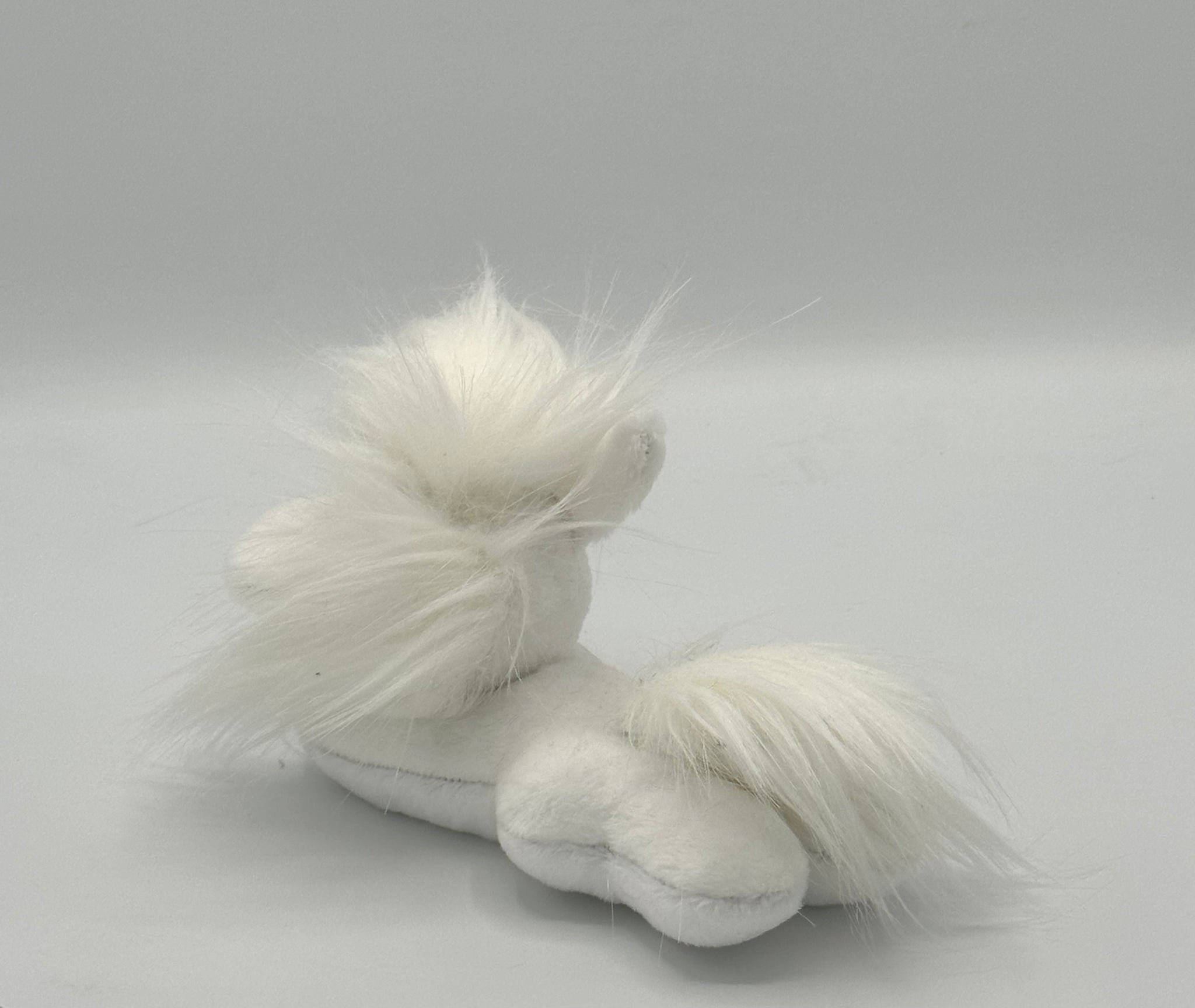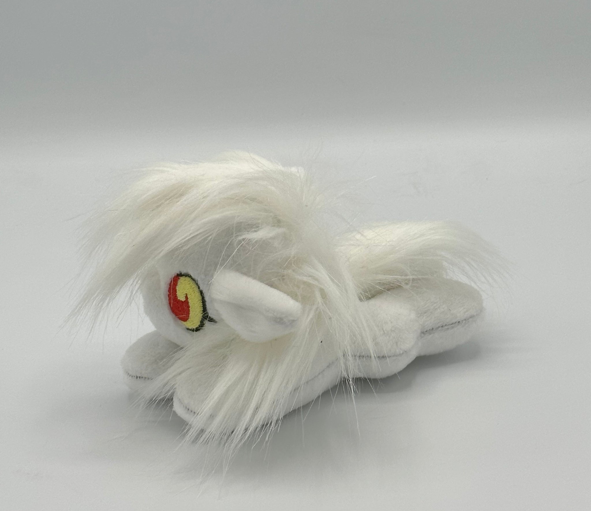 White horse plush laying on belly with white fur hair. Eye is yellow and red.
