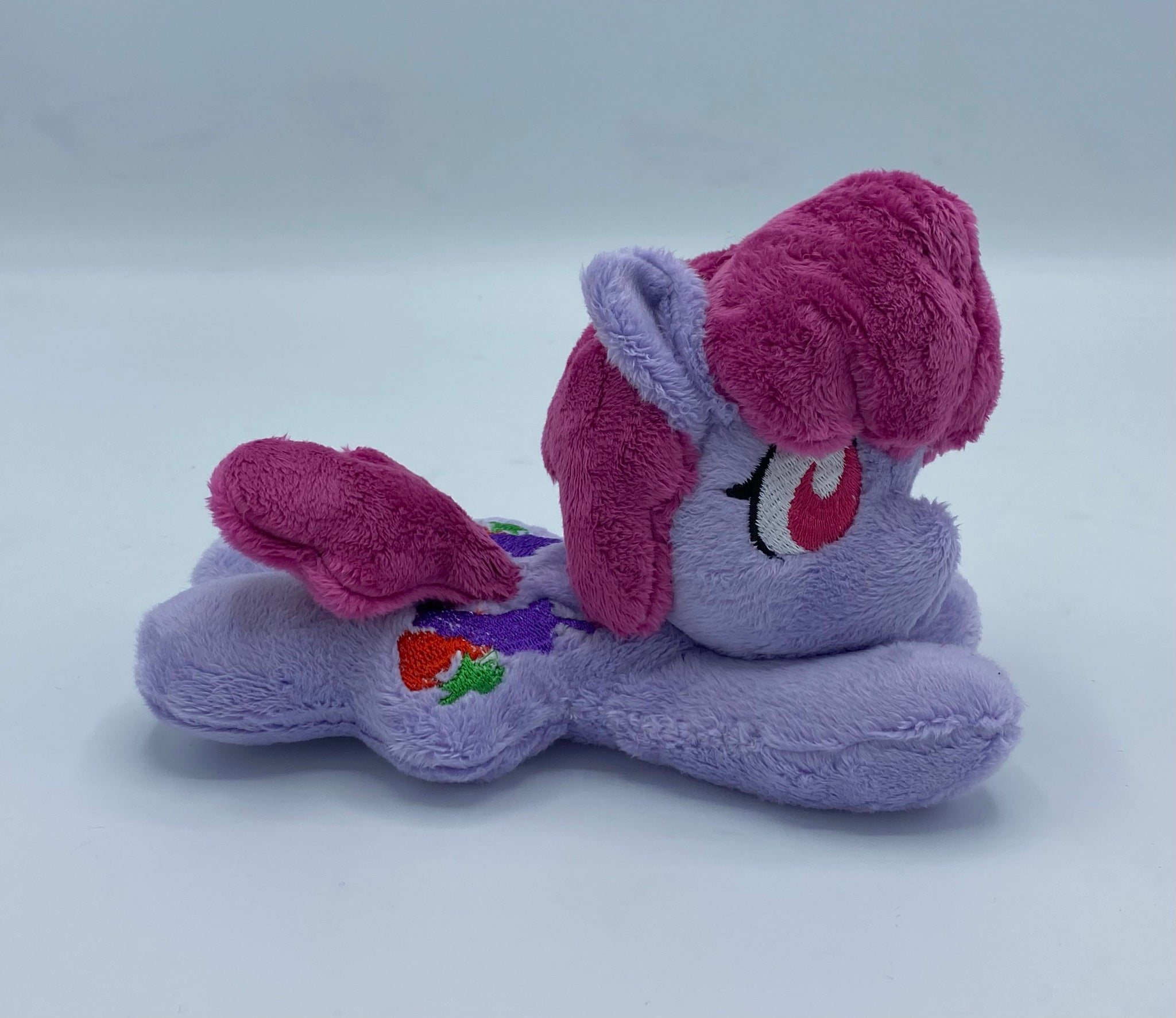 Purple horse plush laying on belly with colorful fruit on flank and maroon hair. Eye is red.