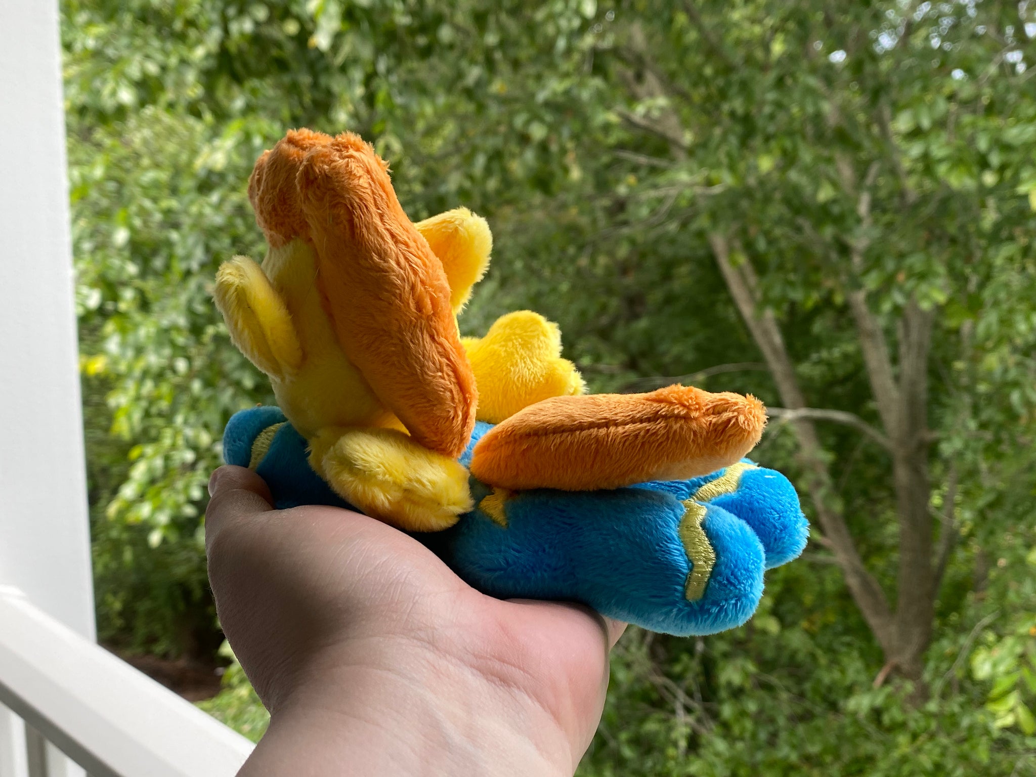 Blue body with yellow head horse plush laying on belly with yellow zigzag on flank and feet and has orange hair. Eye is brown.